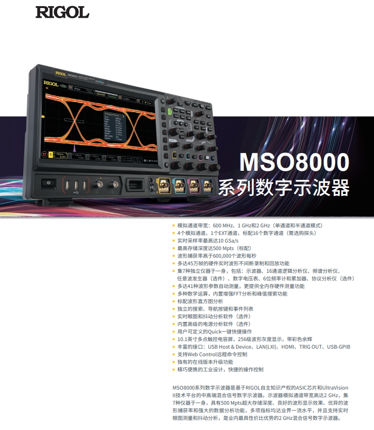 MSO8000系列數(shù)字示波器是基于RIGOL自主知識產(chǎn)權(quán)的ASIC芯片和UItraVisionII技術(shù)平臺的中高端混合信號數(shù)字示波器。MSO8000模擬通道帶寬高達(dá)2GHz,集7種儀器于一身,具有500Mpts超大存儲深度、良好的波形顯示效果、優(yōu)異的波形捕獲率和強(qiáng)大的數(shù)據(jù)分析功能,并且支持實(shí)時眼圖測量和抖動分析,為客戶提供更優(yōu)的測試解決方案。