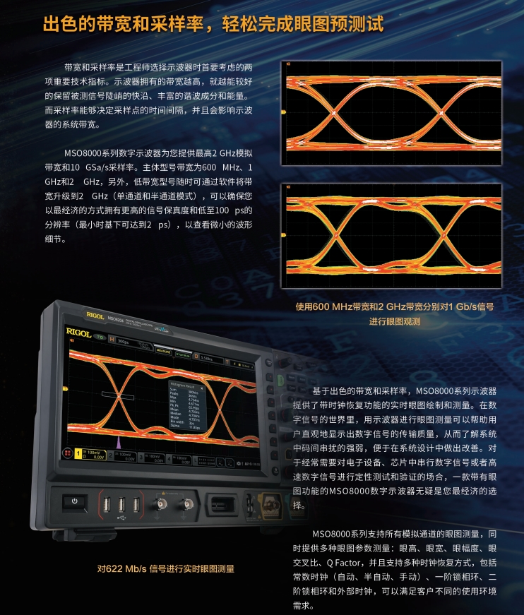 具有500Mpts超大存儲深度、良好的波形顯示效果、優(yōu)異的波形捕獲率和強(qiáng)大的數(shù)據(jù)分析功能,并且支持實(shí)時眼圖測量和抖動分析,為客戶提供更優(yōu)的測試解決方案。